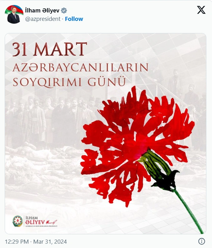 Paylaş Facebook Twitter LinkedIn Pinterest Prezident İlham Əliyev 31 mart – Azərbaycanlıların Soyqırımı Günü ilə əlaqədar paylaşım edib.Metbuat.az paylaşımı təqdim edir: