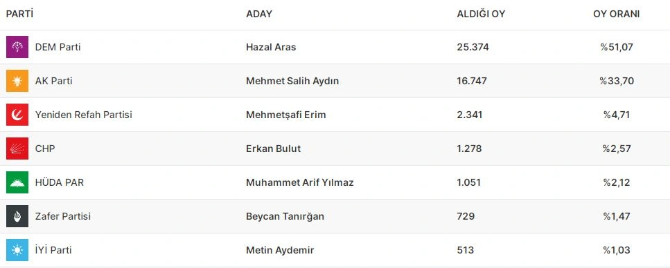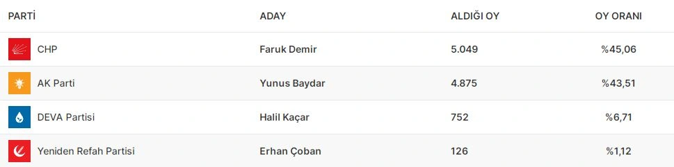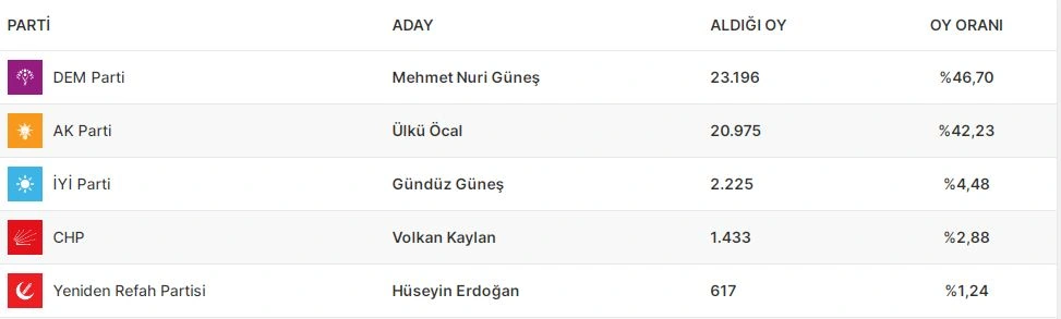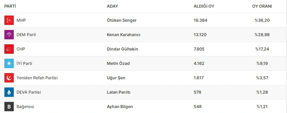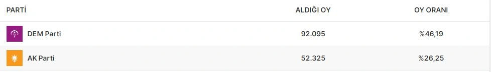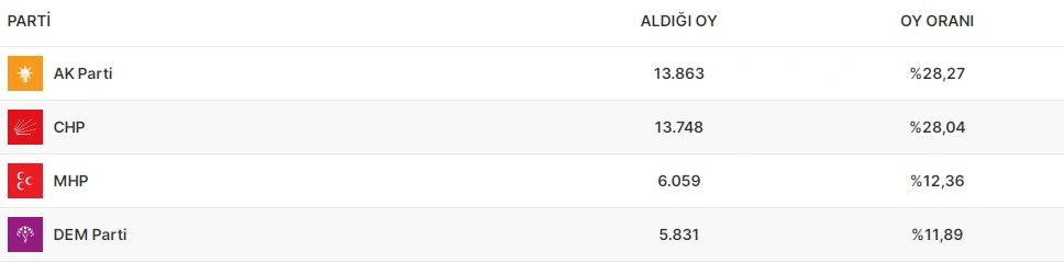 Ardahanın vilayət ümumi məclisində isə AKP 28.27 faiz səslə qalib gəlib. CHP 28.04, MHP 12.36, DEM Partiya 11.89 faiz səs toplayıb. Digər partiyaların nəticələri 10 faizdən aşağı olub.