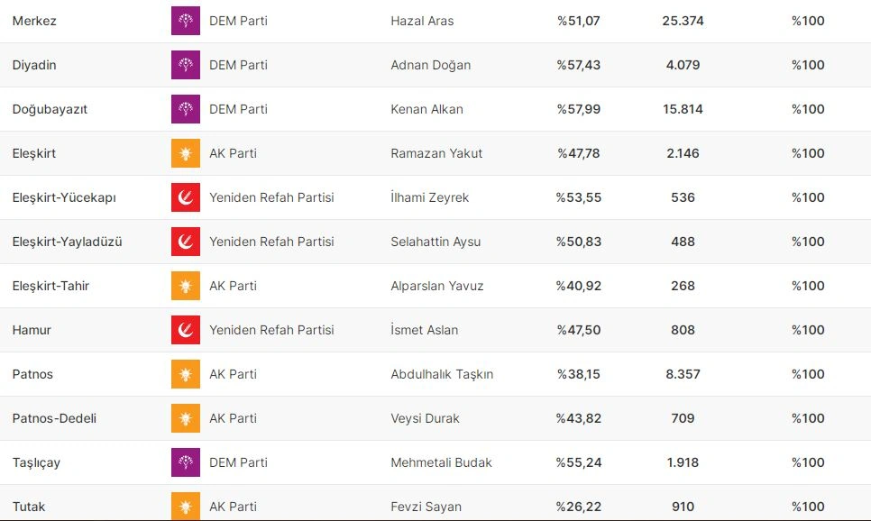 Ağrının rayonlarında isə seçki nəticələrinə görə, Merkez rayonunda DEM Partiya, Diyadində DEM Partiya, Doğubayazıtda DEM Partiya, Eleşkirtdə AKP, Hamurda YRP, Patnosda AKP, Taşlıçayda DEM Partiya, Tutakda AKP qalib gəlib. Eleşkirt rayonunun Yücekapı mahal (belde) bələdiyyəsində YRP, Yayladüzü mahal bələdiyyəsində YRP, Tahir mahal bələdiyyəsində AKP namizədləri sədr seçiliblər. Ağrının Patnos rayonunun Dedeli mahal bələdiyyəsinin sədri vəzifəsini də AKP namizədi tutub.