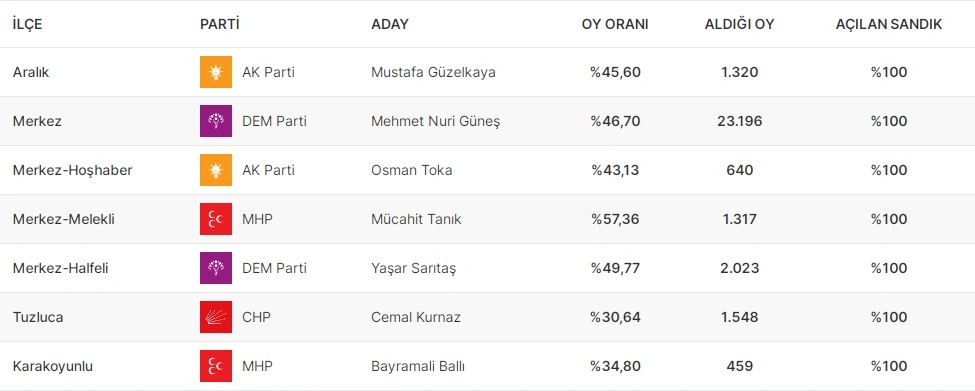 İğdır vilayətinin rayonlarına gəldikdə, Aralık rayonunda bələdiyyə sədrliyini AKP, Merkez rayonunda DEM Partiya, Tuzlucada CHP, Karakoyunluda isə MHP qazanıb. İğdırın Merkez rayonunun mahal (belde) bələdiyyələrində isə nəticələr belə olub: Hoşhaber - AKP, Melekli - MHP, Halfeli - DEM Partiya.
