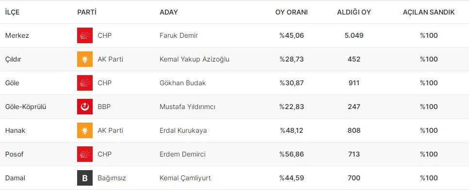 Ardahanın rayonlarında seçkilərin nəticələrinə gəldikdə, Merkez rayonunda CHP, Göledə CHP, Hanakda AKP, Posofda CHP, Damal rayonunda isə bitərəf namizəd Kemal Çamilyurt bələdiyyə sədri seçilib. Gölenin Köprülü mahal (belde) bələdiyyəsinin sədrliyinə Böyük Birlik Partiyasının (BBP) namizədi qələbə çalıb. Ardahanın Çıldır rayonunda AKP və CHP namizədləri bərabər sayda səs toplayıb, formal olaraq hakim partiyanın namizədi qalib elan olunub, lakin hər iki tərəf nəticələrin araşdırılması üçün müvafiq seçki qurumuna müraciət edib. Hələlik rəsmi nəticə bəlli deyil.