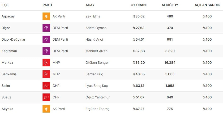 Karsın rayonlarındakı seçki nəticələrinə görə, Arpaçayda AKP, Diqorda DEM Partiya, Kağızmanda DEM Partiya, Merkez rayonunda MHP, Sarıkamışda MHP, Selim rayonunda CHP, Susuz rayonunda CHP, Akyakada isə AKP namizədi bələdiyyə sədri seçilib. Diqor rayonundakı Dağpınar mahalının (belde) bələdiyyəsində isə DEM Partiya qalib gəlib.