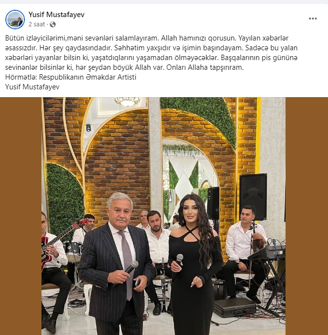Paylaş Facebook Twitter LinkedIn Pinterest Bu gün səhər Əməkdar artist Yusif Mustafayevin ölüm xəbəri yayılıb.Metbuat.az bildirir ki, müğənni özünün sosial media hesabında yayılan iddialarla bağlı paylaşım edib. O qeyd edib ki, yayılan xəbərlər əsassızdır və səhhəti yaxşıdır.
