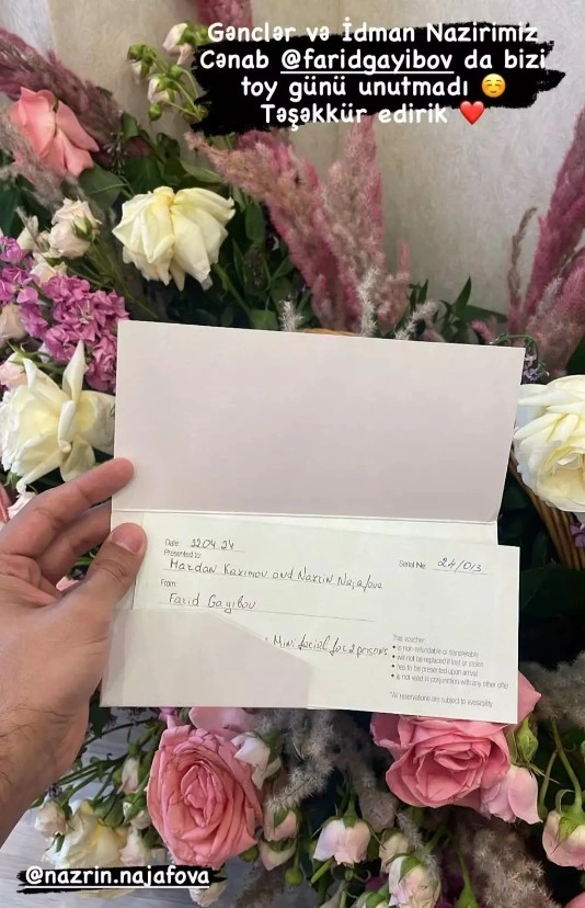 Metbuat.az bildirir ki, toya hədiyyə göndərənlər arasında Gənclər və İdman Naziri Fərid Qayıbov da olub. Bununla bağlı Mərdan Kazımov özünün sosial şəbəkə hesabında paylaşım edib.
