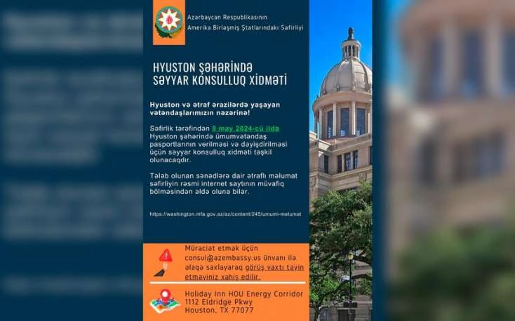 “Səfirlik tərəfindən 8 may 2024-cü il tarixində Hyuston şəhərində ümumvətəndaş pasportlarının verilməsi və dəyişdirilməsi üçün səyyar konsulluq xidməti təşkil olunacaqdır. Tələb olunan sənədlərə dair ətraflı məlumata link vasitəsilə keçid edə bilərsiniz: https://washington.mfa.gov.az/az/content/245/umumi-melumat. Müraciət etmək üçün [email protected] ünvanı ilə əlaqə saxlayaraq görüş vaxtı təyin etməyiniz xahiş olunur”, – səfirliyin sosial şəbəkə hesabında diqqətə çatdırılıb.
