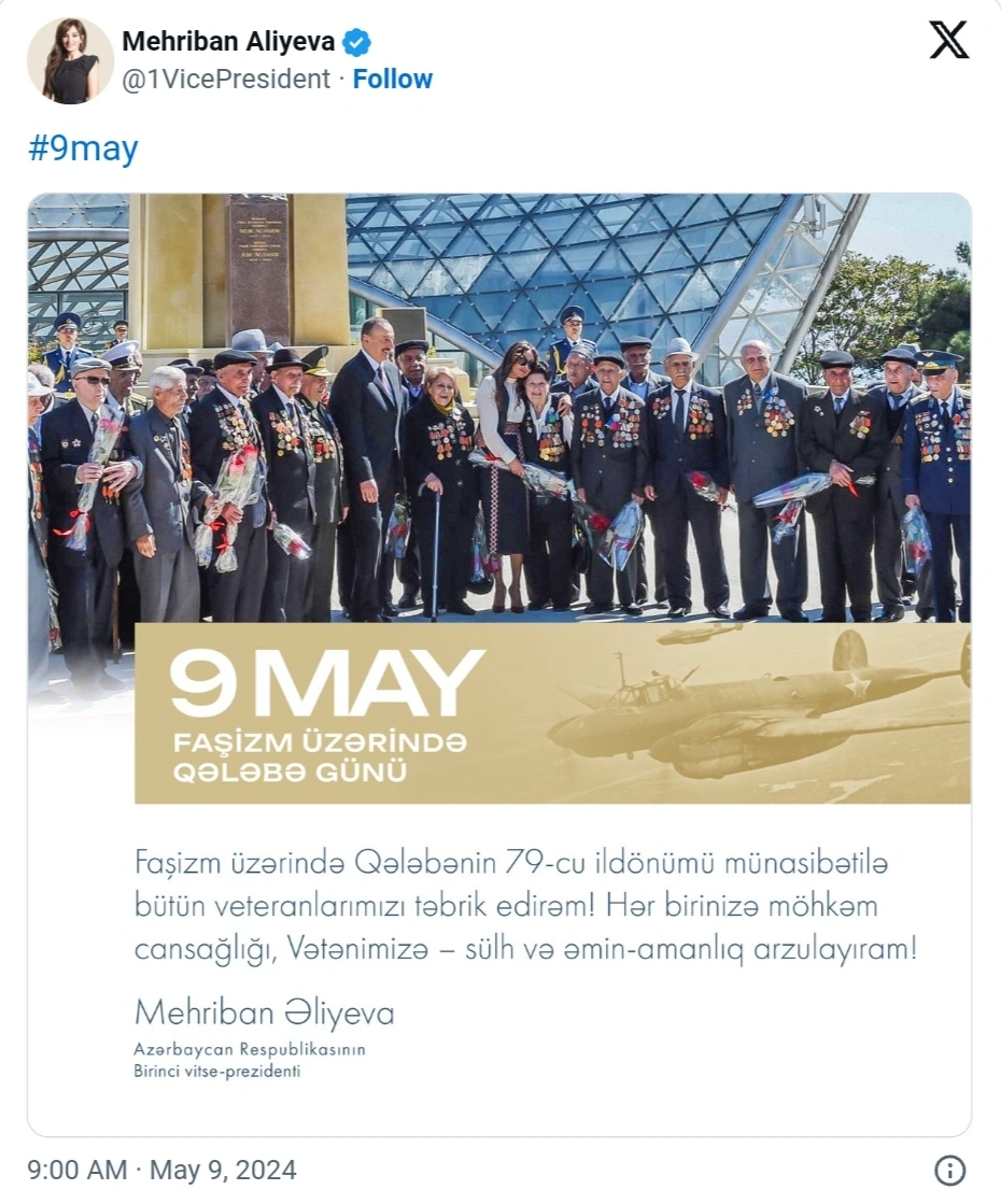 “Faşizm üzərində Qələbənin 79-cu ildönümü münasibətilə bütün veteranlarımızı təbrik edirəm! Hər birinizə möhkəm cansağlığı, Vətənimizə sülh və əmin-amanlıq arzulayıram!”