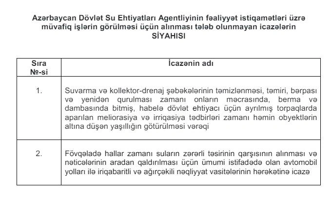 Prezident İlham Əliyev “Azərbaycan Dövlət Su Ehtiyatları Agentliyinin fəaliyyət istiqamətləri üzrə müvafiq işlərin görülməsi üçün alınması tələb olunmayan icazələrin siyahısı”nın təsdiq edilməsi haqqında fərman imzalayıb.