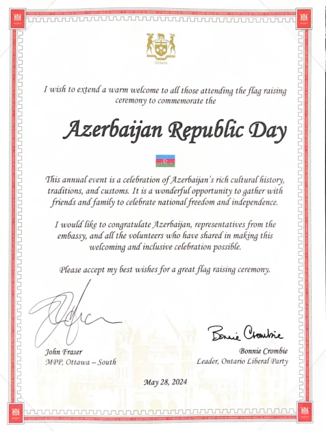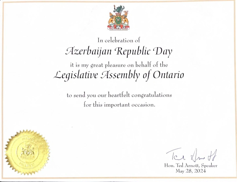Qeyd edək ki, mayın 28-də Azərbaycanın Müstəqillik Günü münasibətilə Ontario əyalətinin Qanunvericilik Assambleyasının qarşısında Azərbaycan Bayrağı ucaldılıb.