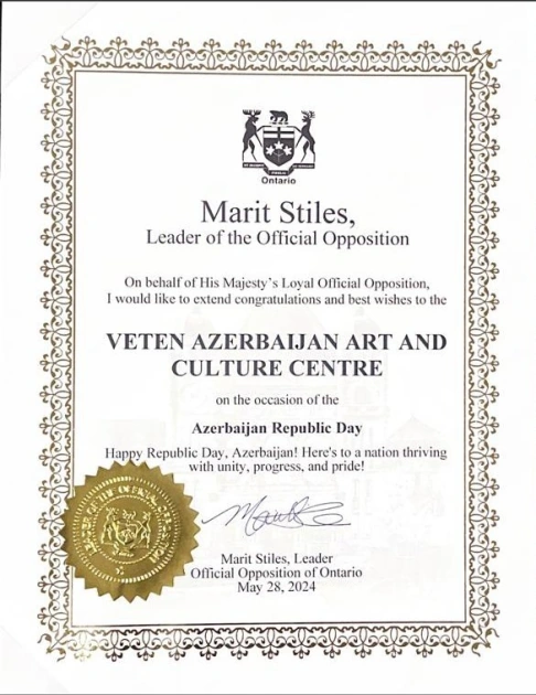 Diasporla İş üzrə Dövlət Komitəsindən Modern.az-a bildirilib ki, Ontario Qanunvericilik Assambleyasının spikeri Ted Arnot, Assambleyanın deputatı Marit Stayls, Quelf əyalətinin deputatı Mayk Şrayner və Cənubi Ottava əyalət parlamentinin üzvü Con Freyzer, Ontario Liberal Partiyasının lideri Bonni Krombi Azərbaycanın Müstəqillik Günü münasibətilə “Vətən” Azərbaycan İncəsənət və Mədəniyyət Mərkəzinə təbrik məktubları ünvanlayıblar.