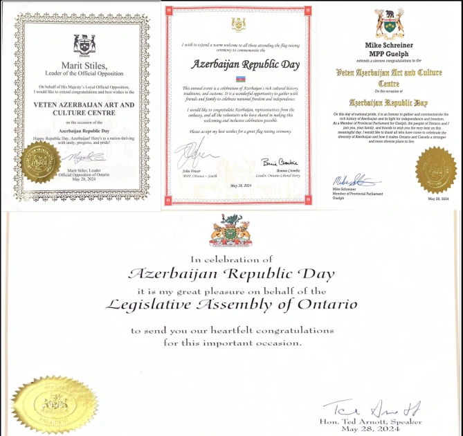 Kanadanın Ontario əyalətinin rəsmi şəxsləri və siyasi partiya rəhbərləri 28 May – Müstəqillik Günü ilə bağlı Azərbaycan icmasını təbrik ediblər.
