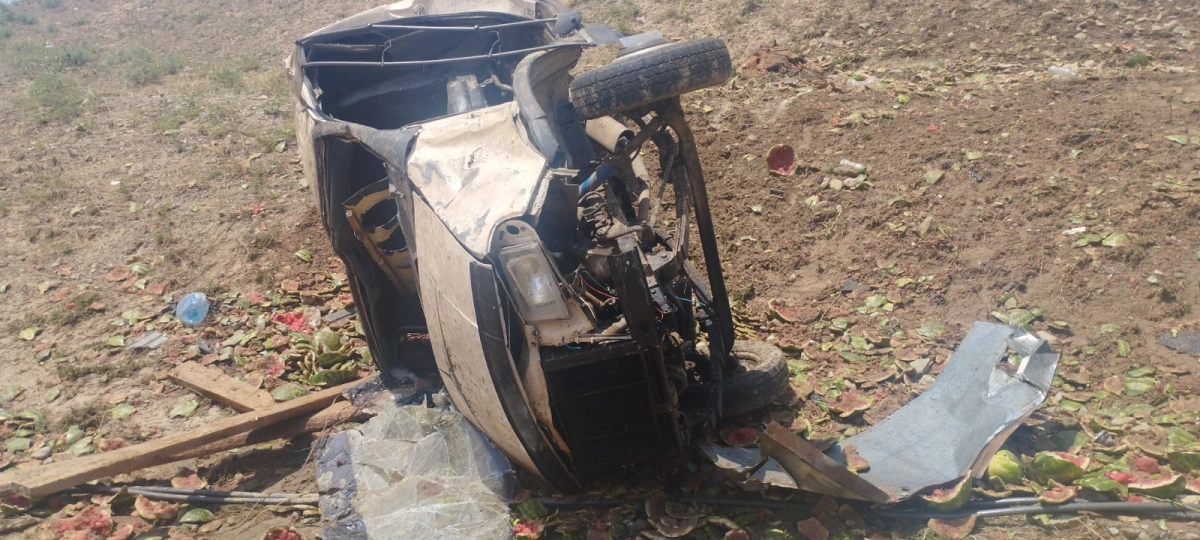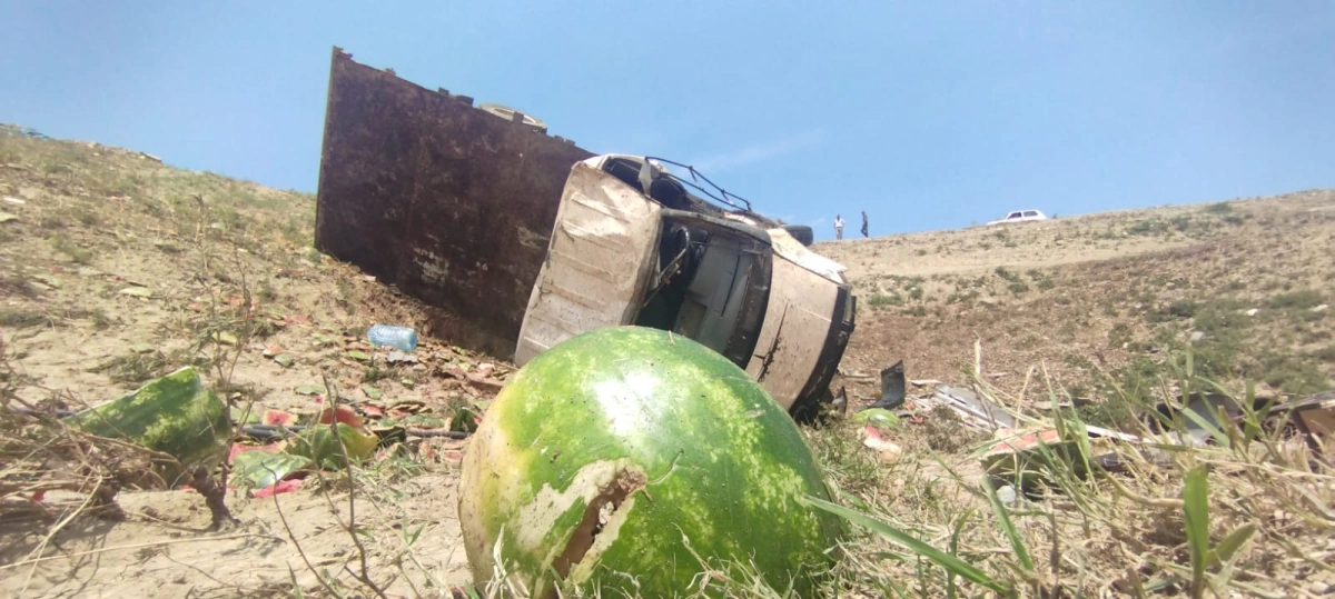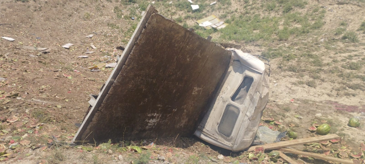 Qəza nəticəsində qarpız dolu yük avtomobili yararsız hala düşüb.