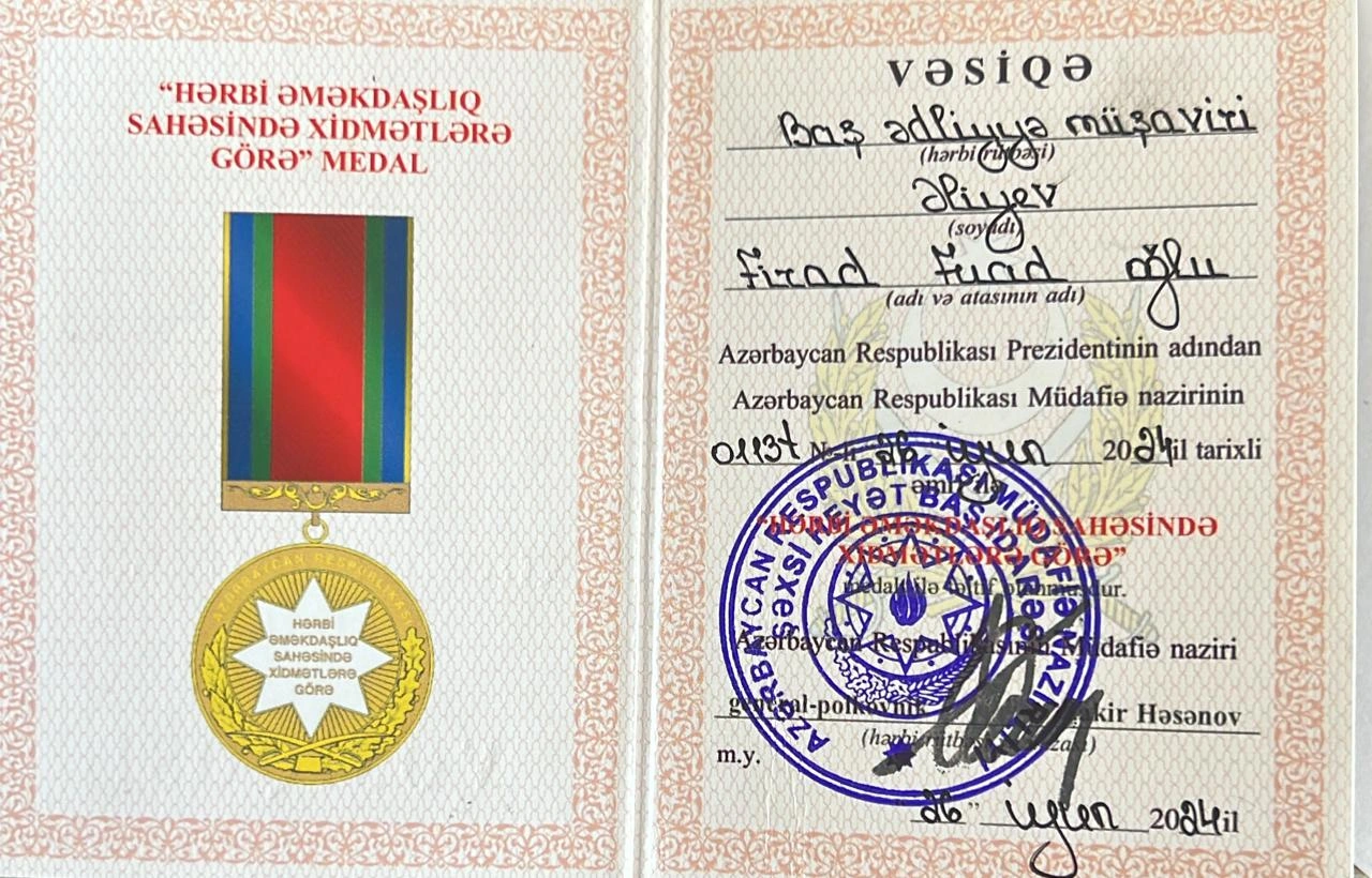 Metbuat.az xəbər verir ki, təltif edilənlər sırasında Respublika Hərbi prokurorunun böyük köməkçisi, Hərbi Prokurorluğun Mətbuat xidmətinin rəhbəri Firad Əliyev də var. F. Əliyevə "Hərbi Əməkdaşlıq sahəsində xidmətlərə görə" medalı verilib.
