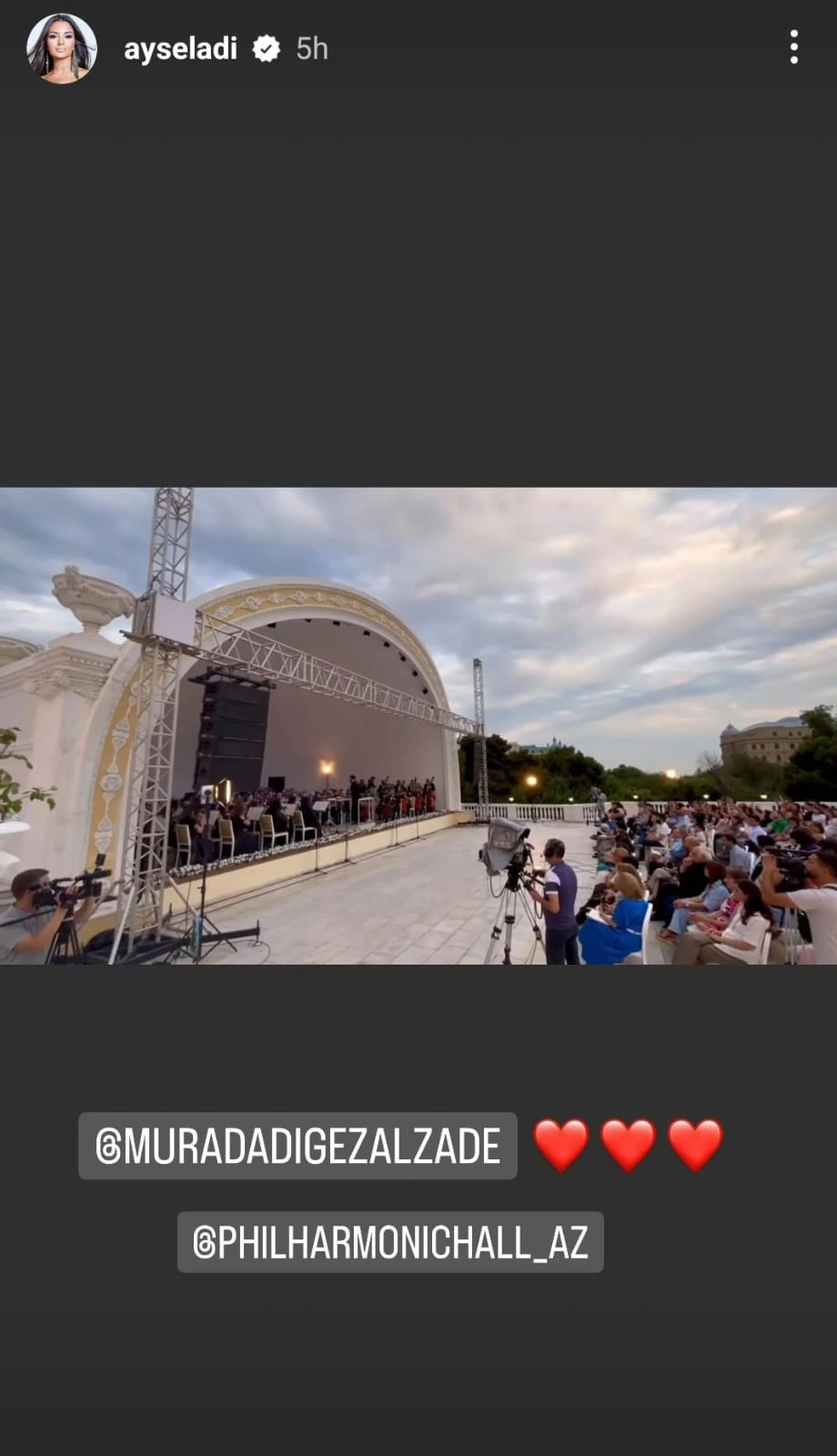 Metbuat.az xəbər verir ki, o, özünün "Instagram" hesabında Azərbaycan Dövlət Filarmoniyasındakı tədbirdən foto paylaşıb və paylaşıma filarmoniyanın direktoru, Xalq artisti Murad Adıgözəlzadəni işarələyib.