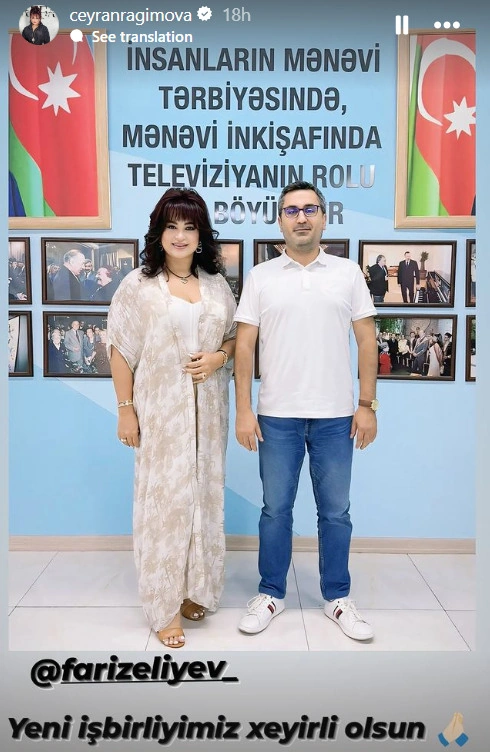 Telekanalın icraçı direktoru Fariz Əliyevlə fotosunu paylaşan aparıcı “Yeni iş birliyimiz xeyirli olsun”, - şərhini yazıb.