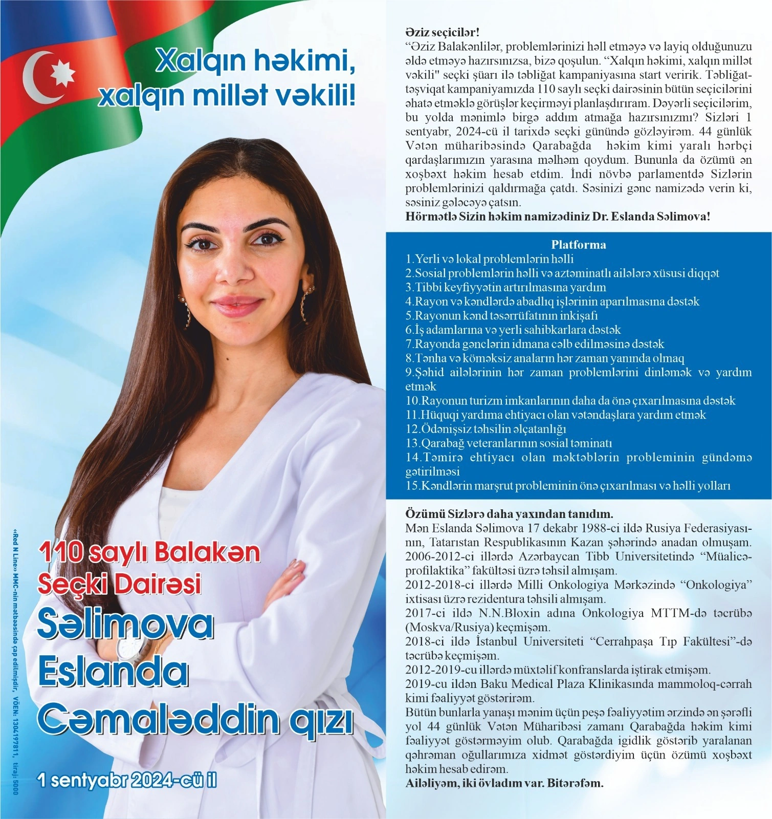 Dr. Səlimova, seçkilərdə dəstək üçün seçicilərə müraciət edir və Balakənin və ölkənin gələcəyini daha yaxşı etmək məqsədilə səs verilməsini xahiş edir.