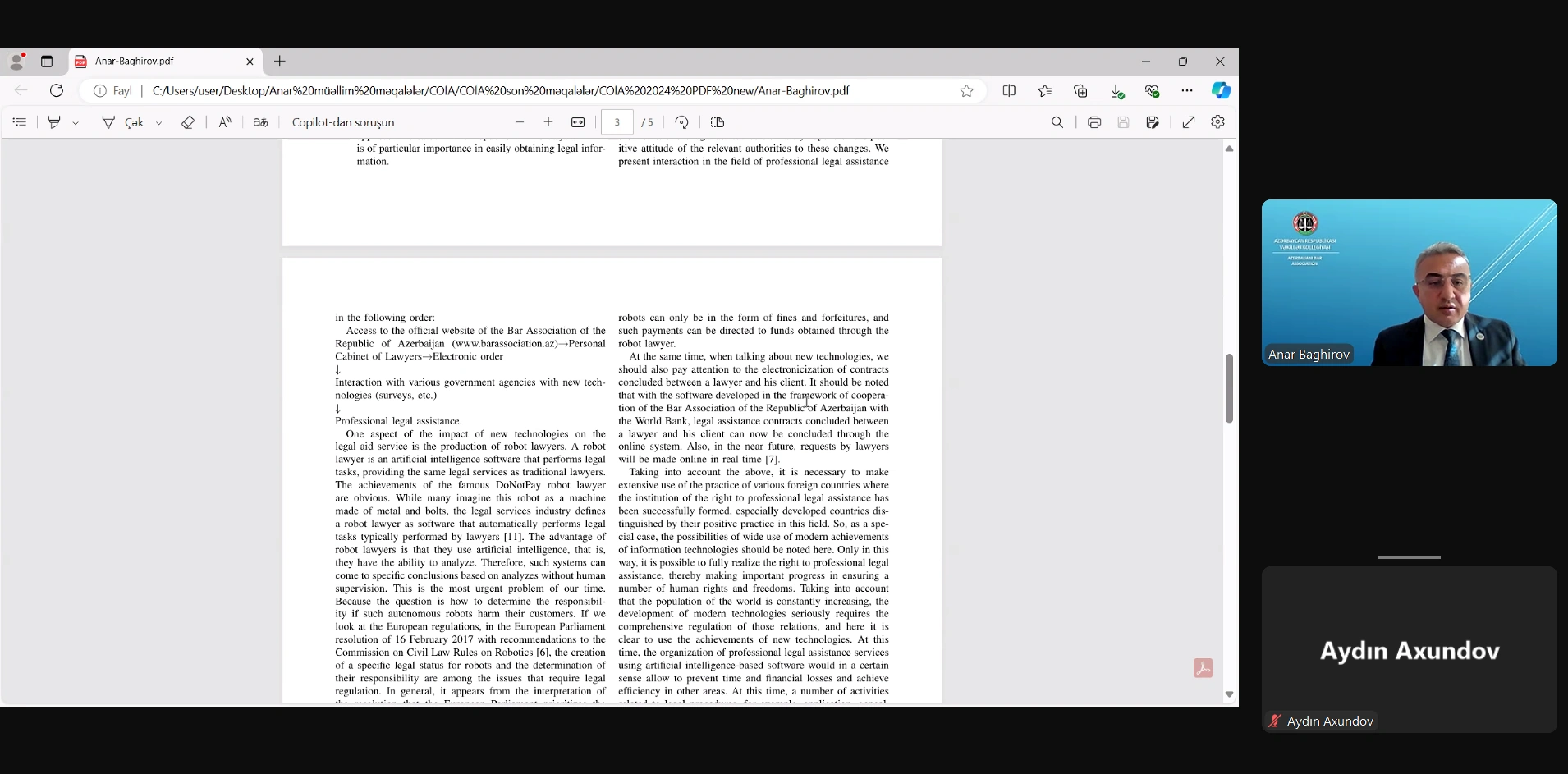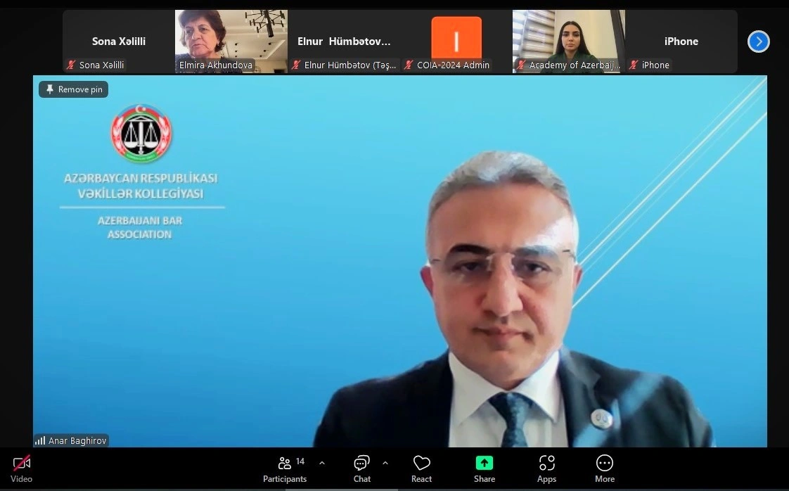 Həmçinin “Hüquqi yardım sahəsində yeni texnologiyalardan istifadənin xüsusiyyətləri və istiqamətləri” mövzusunda ətraflı çıxış edən Anar Bağırov mövzu üzrə aktual məsələlərə və həlli tələb olunan problemlərə toxunub.