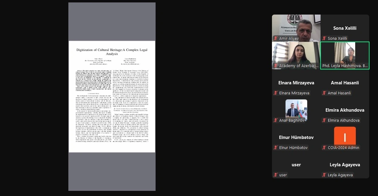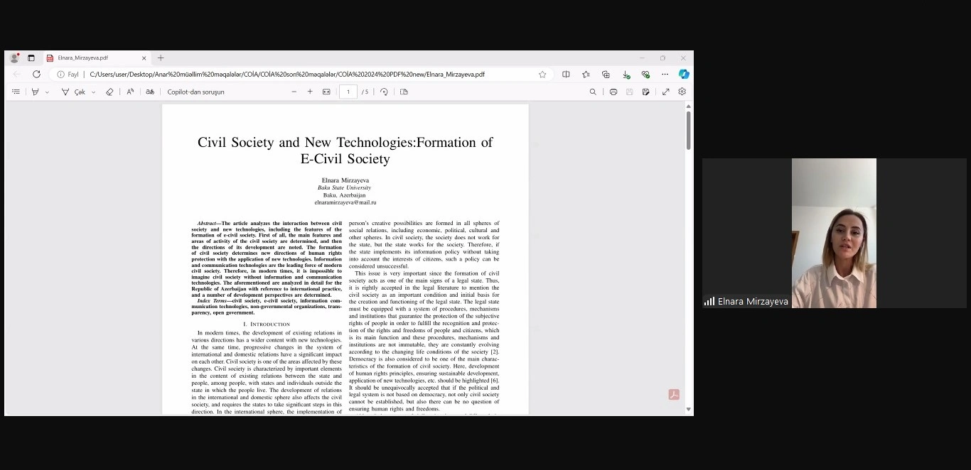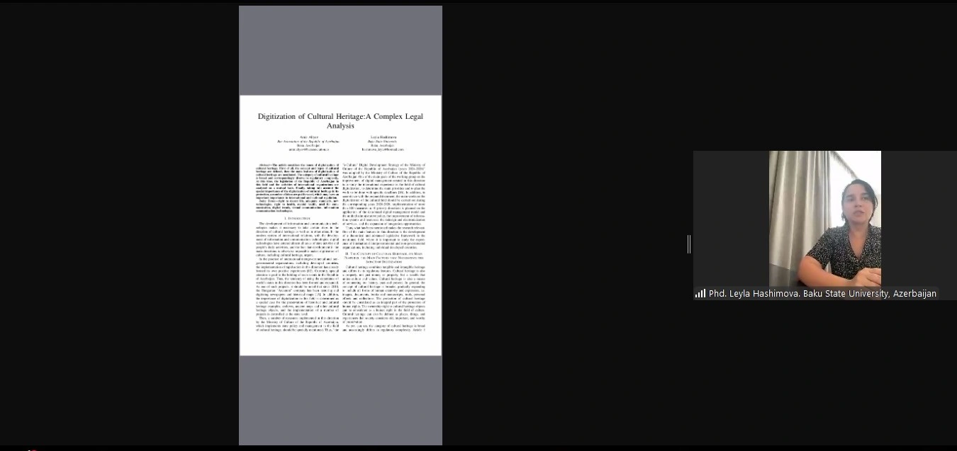 Daha sonra hüquq elmləri doktoru, professor Əmir Əliyev və hüquq üzrə fəlsəfə doktoru Leyla Həşimovanın “Mədəni irsin rəqəmsallaşdırılması: kompleks hüquqi təhlil”, Mələkxanım Rəhimovanın “Rəqəmsal informasiya cəmiyyətində kommunikasiya layiqli psixi sağlamlıq hüququ kimi”, hüquq üzrə fəlsəfə doktoru Elnur Hümbətovun “Virtual məkanda fərdi məlumatların təhlükəsizliyinin təminatı”, hüquq üzrə fəlsəfə doktoru Elnarə Mirzəyevanın “Vətəndaş cəmiyyəti və yeni texnologiyalar: e-vətəndaş cəmiyyətinin formalaşdırılması” mövzularında məruzələri dinlənilib.