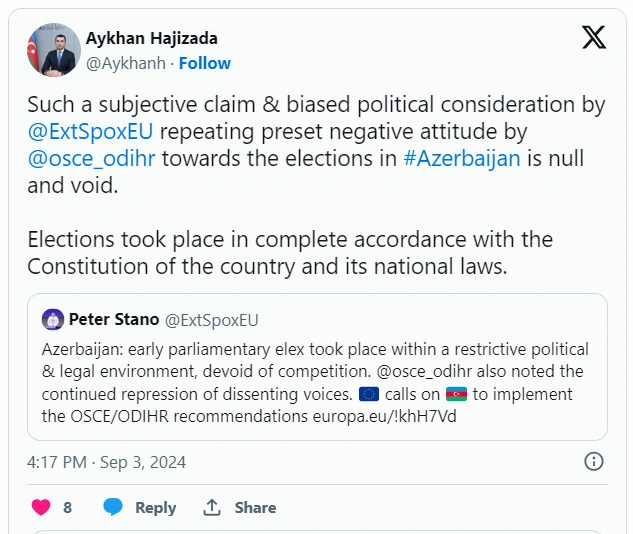 Metbuat.az xəbər verir ki, Azərbaycan Xarici İşlər Nazirliyinin Mətbuat xidməti idarəsinin rəisi Ayxan Hacızadə bunu Avropa İttifaqının seçkilərlə bağlı yaydığı məlumata cavab olaraq "X"də yazıb.