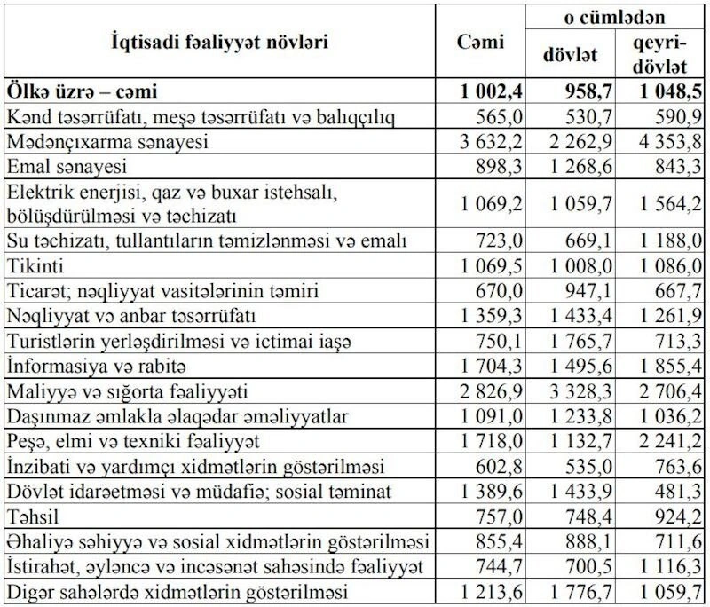 Bu ilin yanvar-iyul aylarında ölkə iqtisadiyyatında muzdla çalışan işçilərin orta aylıq nominal əməkhaqqı 2023-cü ilin müvafiq dövrünə nisbətən 8,3% artaraq 1002,4 manat təşkil edib. Metbuat.az xəbər verir ki, əməkhaqqı neft-qaz sektorunda 3 782,9 manat, qeyri neft-qaz sektorunda 950,6 manat olub.Dövlət müəssisələrində çalışan işçilərin əməkhaqları 958,7 manat, özəl müəssisələrdə isə 1 048,5 manat olub.İqtisadi fəaliyyət və mülkiyyət növləri üzrə orta aylıq nominal əməkhaqqı aşağıdakı kimi olub: