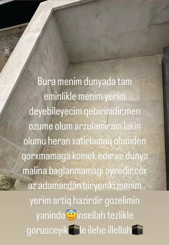 Metbuat.az olay.az-a istinadən xəbər verir ki, o, aktrisanın instaqramında şəkil paylaşıb və bildirib ki, özünə qəbir yeri ayırıb.