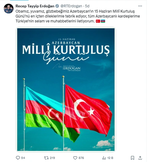 Obamız, yurdumuz, göz bəbəyimiz olan Azərbaycanı 15 İyun Milli Qurtuluş Günü münasibəti ilə ürəkdən təbrik edir, bütün azərbaycanlı qardaşlarıma Türkiyənin salamlarını və sevgilərini çatdırıram.