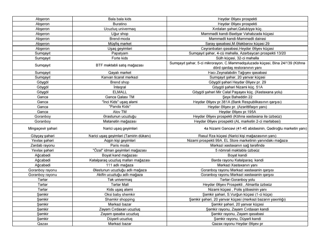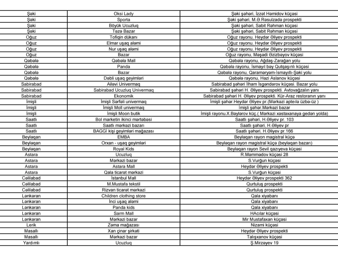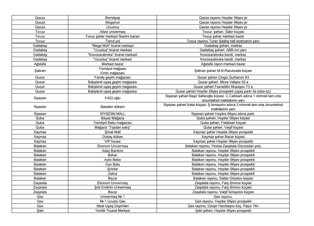 Ümumi təhsil müəssisələrində tətbiq edilən vahid məktəbli geyimlərinin əldə edilməsinin asanlaşdırılması və valideynlər üçün əlçatanlığın təmin edilməsi məqsədilə ölkə üzrə satış məntəqələrinin ünvanları təqdim edilib.