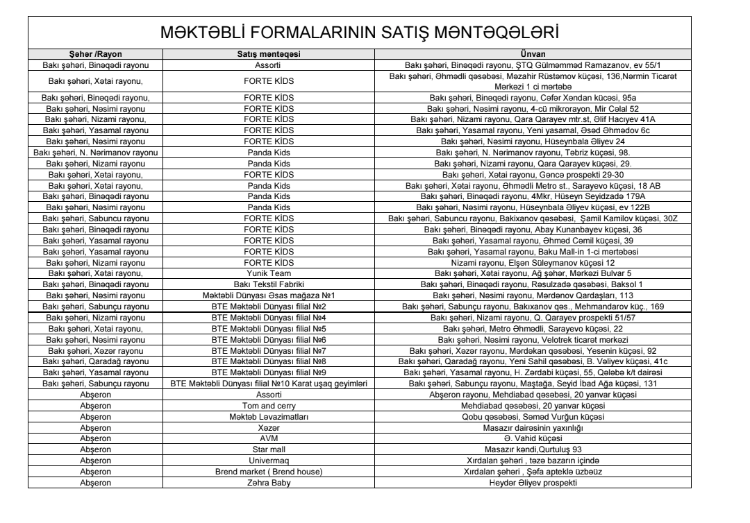 Modern.az məktəbli formalarının satış məntəqələrini təqdim edir: