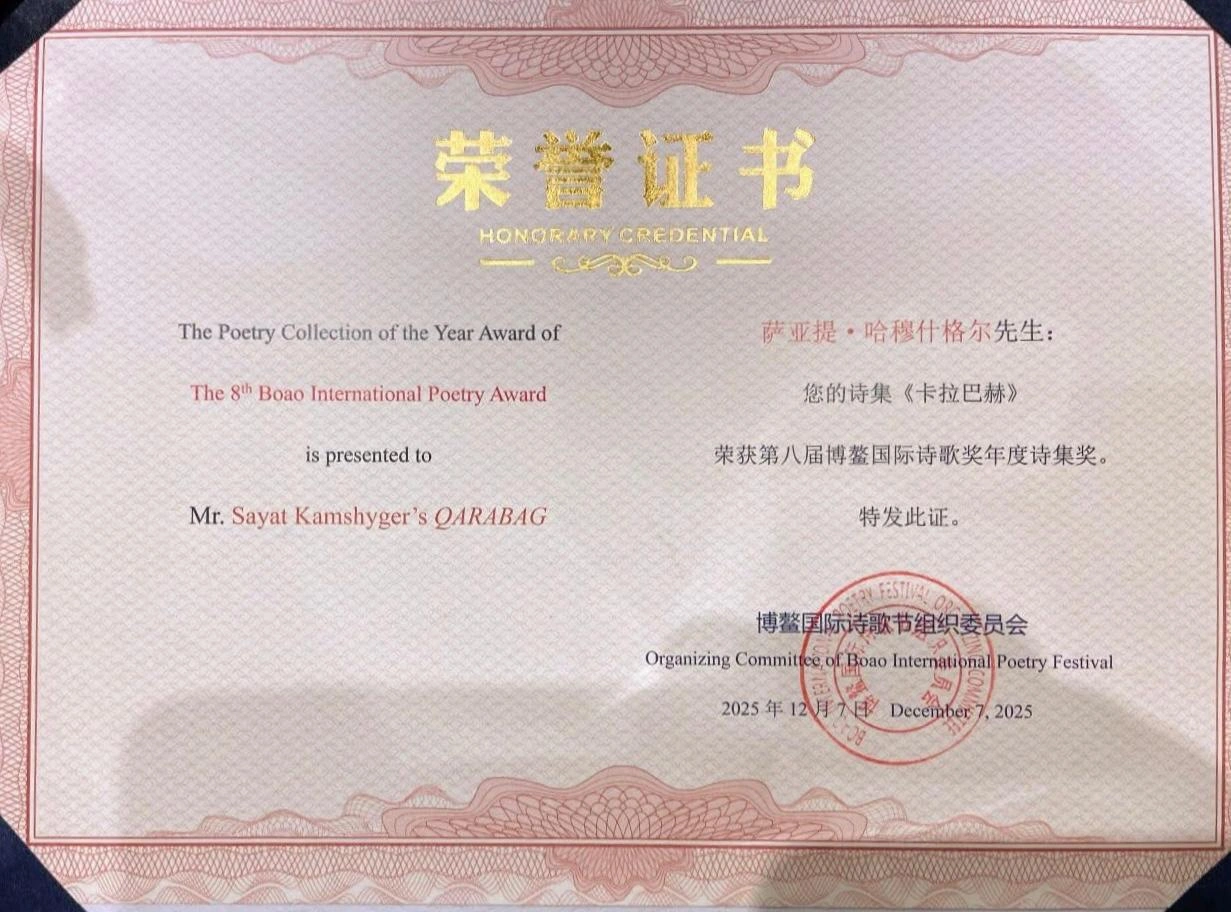 Qardaş Qazaxıstanın yeni nəsil şairlərindən Sayat Kamşıgerin “Qarabağ” adlı poeması beynəlxalq səviyyədə yüksək dəyərləndirilib. Əsər Beynəlxalq PEN Klubunun (PEN (Poets, Essayists, Novelists) International Club) “İlin ən yaxşı kitabı” mükafatına layiq görülüb. Mükafat ötən həftə sonu Avstraliyanın Sidney Opera Evində keçirilən möhtəşəm törəndə təqdim edilib.