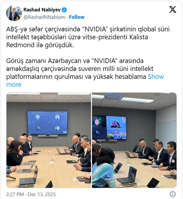 "Həmçinin suveren süni intellekt ekosisteminin əsas elementləri və iştirakçıları, startapların inkişafı, süni intellekt üzrə kadr hazırlığı və "Nvidia" texnologiyalarının strateji sahələrdə tətbiqi üzrə birgə təşəbbüslər barədə fikir mübadiləsi apardıq", - deyə nazir vurğulayıb.