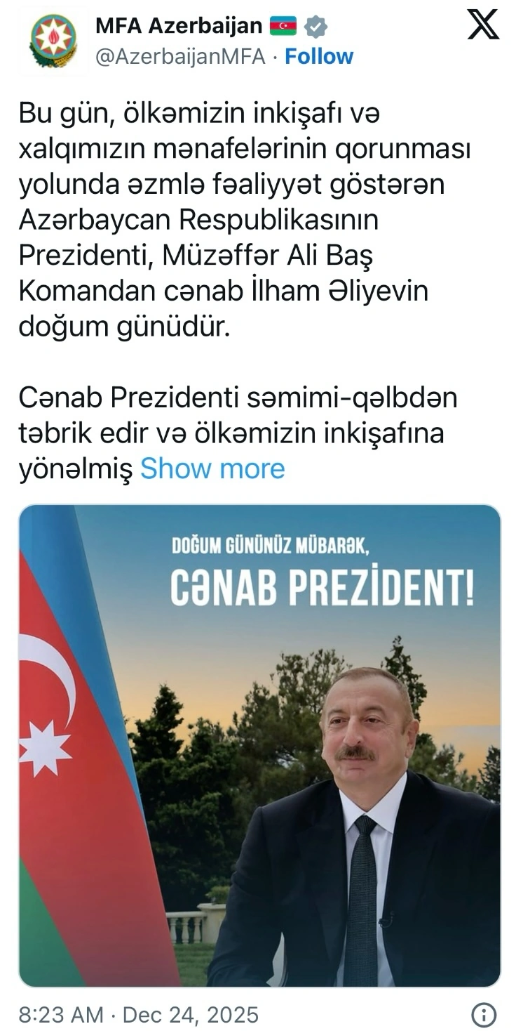 "Bu gün, ölkəmizin inkişafı və xalqımızın mənafelərinin qorunması yolunda əzmlə fəaliyyət göstərən Azərbaycan Respublikasının Prezidenti, Müzəffər Ali Baş Komandan cənab İlham Əliyevin doğum günüdür. Cənab Prezidenti səmimi-qəlbdən təbrik edir və ölkəmizin inkişafına yönəlmiş qətiyyətli fəaliyyətində daimi uğurlar arzulayırıq. Doğum gününüz mübarək, cənab Prezident!"