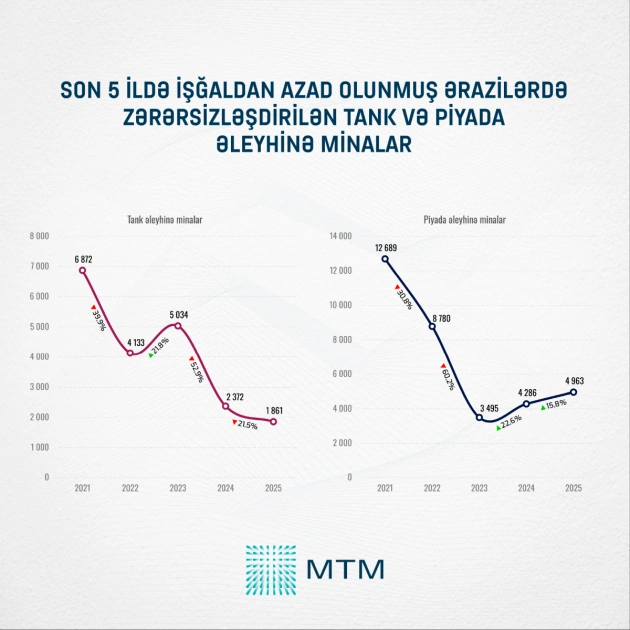 Aparılan təhlil nəticəsində müəyyən edilib ki, 2025-ci ildə işğaldan azad olunmuş ərazilərdə həyata keçirilən minatəmizləmə əməliyyatları zamanı 1 861 ədəd tank əleyhinə mina və 4 min 963 ədəd piyada əleyhinə mina aşkar edilərək zərərsizləşdirilib.