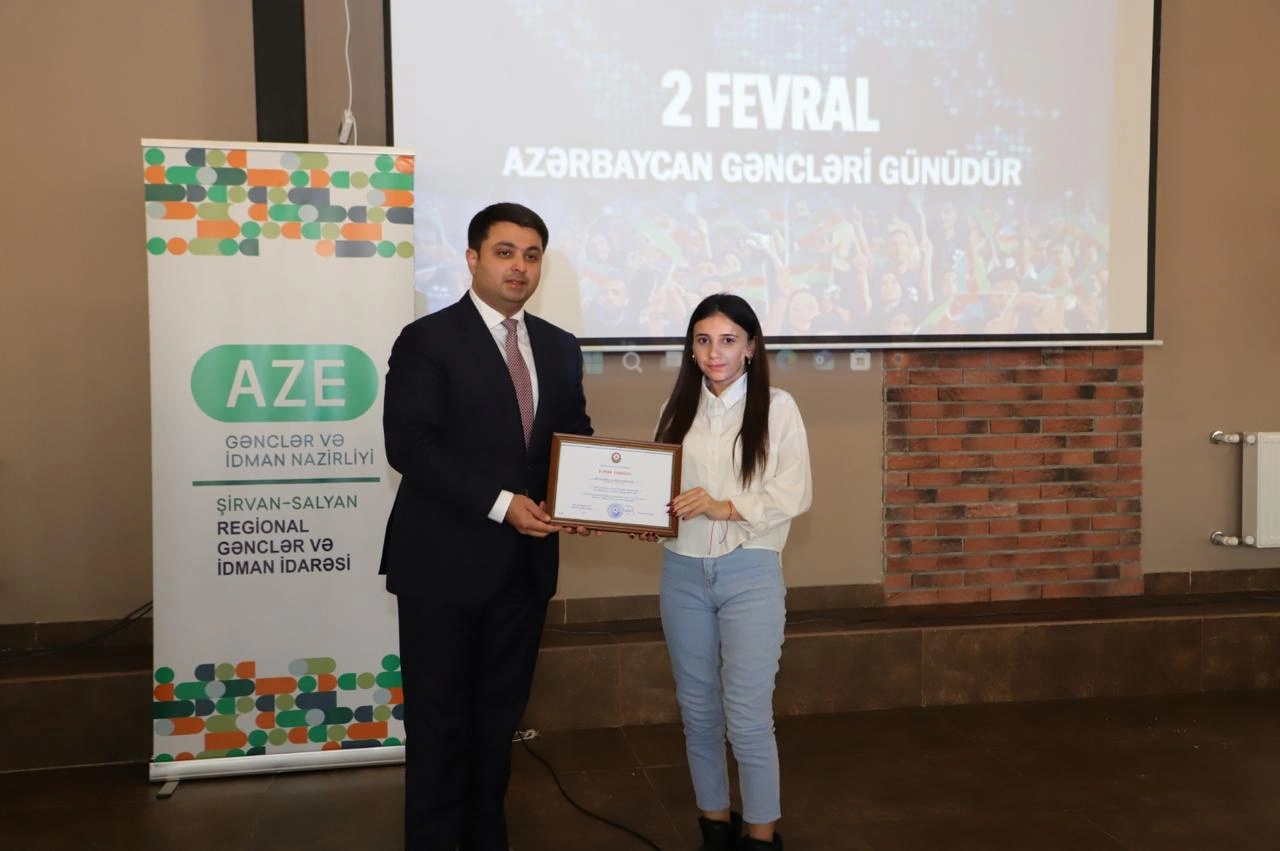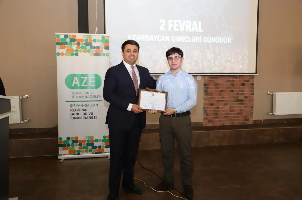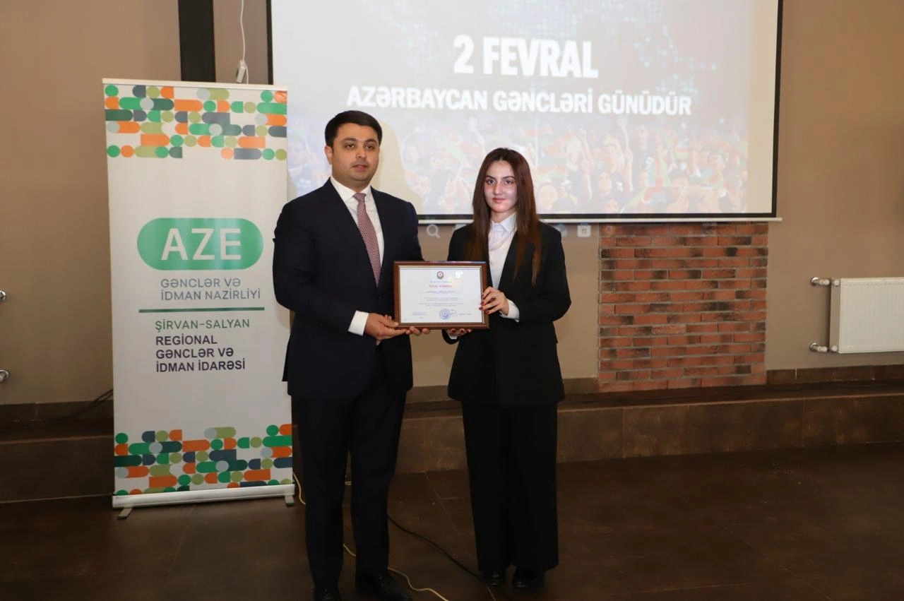 Tədbirdə çıxış edən Şirvan-Salyan Regional Gənclər və İdman İdarəsinin rəisi Aydın Yusifov 2 Fevral – Azərbaycan Gəncləri Gününün gənclərə göstərilən dövlət qayğısının nümunəsi olduğunu bildirmiş, gənclərin asudə vaxtının səmərəli təşkili, idmana və sağlam həyat tərzinə cəlb olunması istiqamətində görülən işlərdən, ölkəmizdə həyata keçirilən dövlət gənclər siyasətindən, bu siyasətin regionlarda icrası və əldə olunan nəticələrdən bəhs etmişdir.