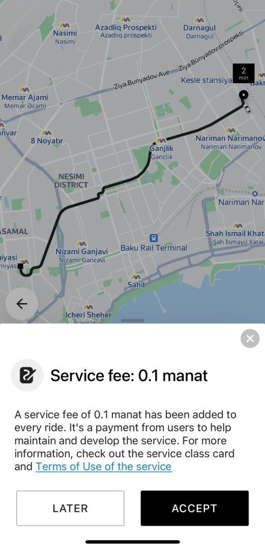 "Hər gedişə 0,1 manat xidmət haqqı əlavə olunub. Bu, xidməti saxlamaq və inkişaf etdirmək üçün istifadəçilərdən alınan ödənişdir", - xidmətin mobil tətbiqində bildiriş edilib.