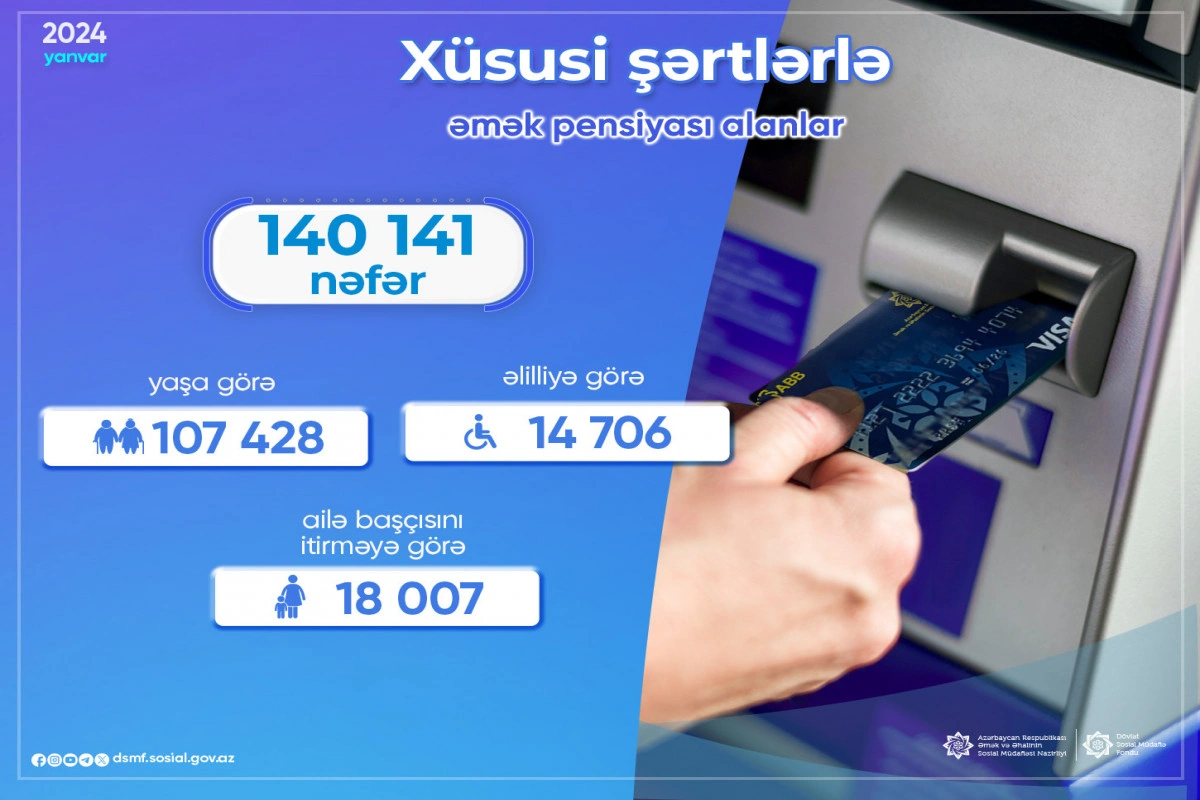 2024-cü ilin yanvar ayında xüsusi şərtlərlə əmək pensiyası alanların sayı 140 141 nəfər olub.