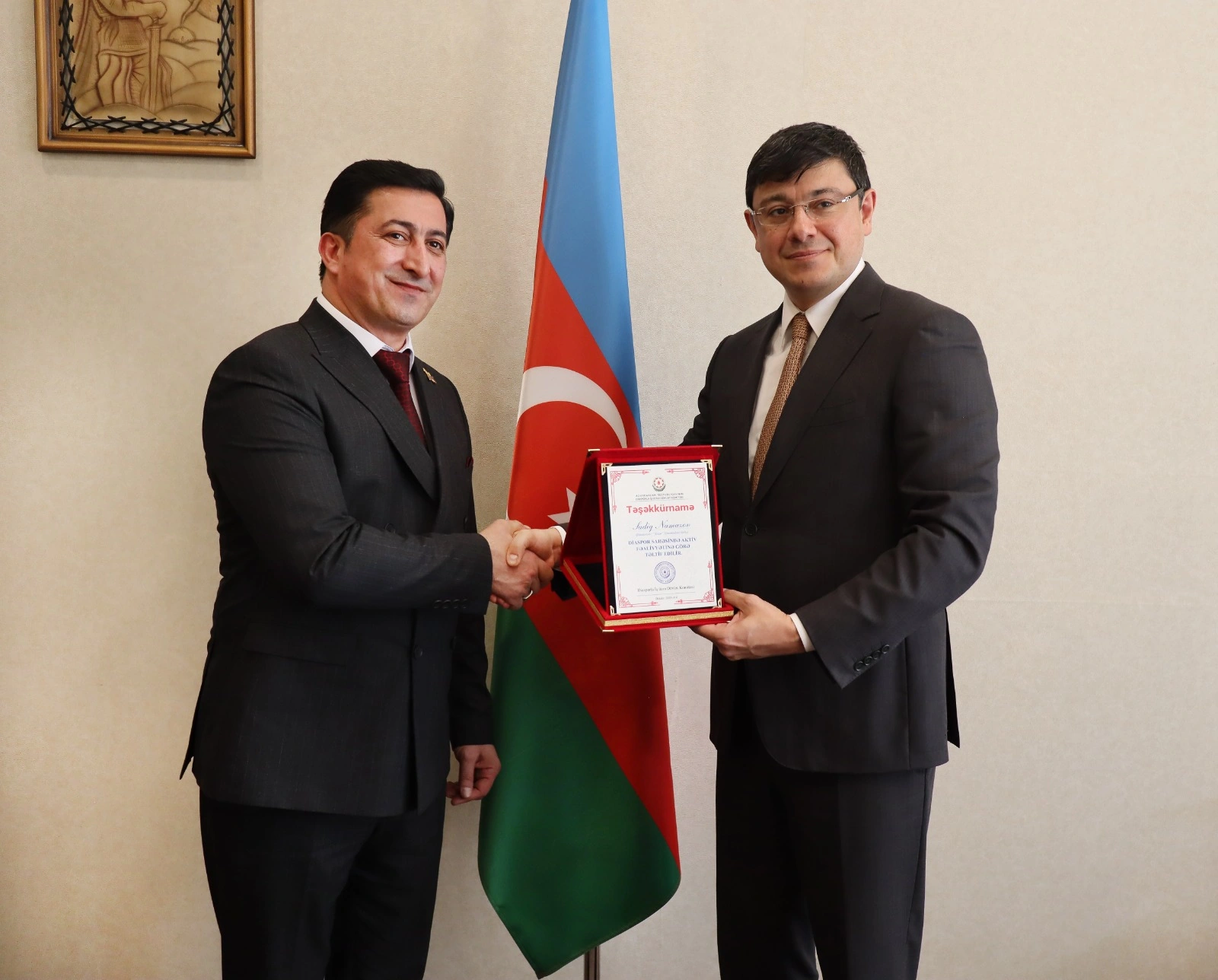 Qazaxıstanda yaşayan azərbaycanlı musiqiçi, mahir tar ifaçısı “Xəzər” Etno-Mədəni Birliyinin sədr müavini Sadiq Namazovla görüşdə isə iki ölkə arasındakı münasibətərin sarsılmazlığından, dost ölkədə yaşayan azərbaycanlıların bu münasibətlərin inkişafına verdiyi töhfələrdən və soydaşlarımızın yaşadıqları cəmiyyətə uğurlu inteqrasiyasından danışılıb. Bir sıra beynəlxalq müsabiqələrdə Azərbaycan və türk musiqilərinin təbliğindəki roluna görə nüfuzlu mükafatlara layiq görülən və bir neçə müsabiqənin laureatı olan soydaşımıza uğurlu diaspor fəaliyyətinə görə komitə adından təşəkkürnamə təqdim olunub.