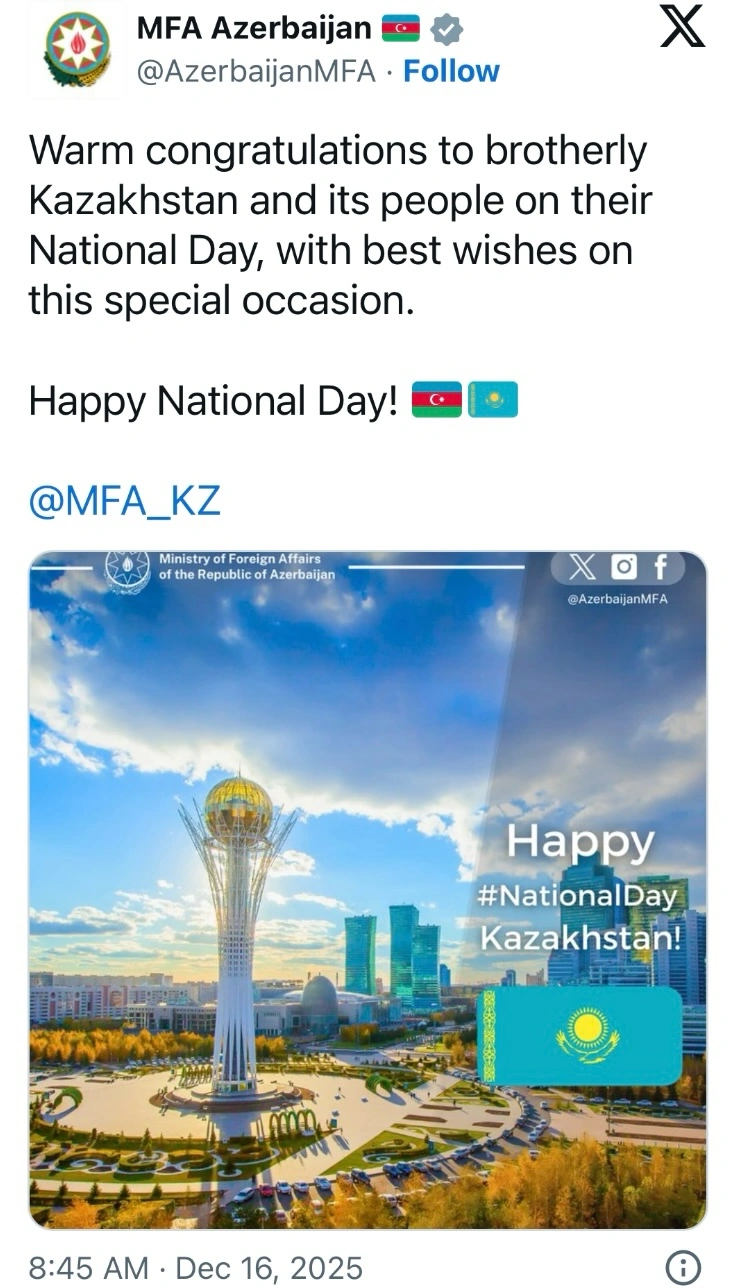 Azərbaycan Xarici İşlər Nazirliyi (XİN) Qazaxıstanı Milli Günü münasibətilə təbrik edib.