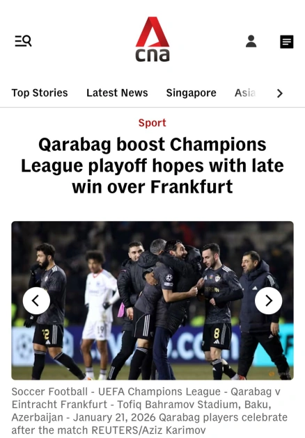 Asiyanın ən böyük xəbər portallarından biri olan “CNA” “Reuters” agentliyinə istinadən qələbənin "Qarabağ"ın turnir cədvəlindəki mövqeyini (18-ci pillə) necə möhkəmləndirdiyindən yazıb.