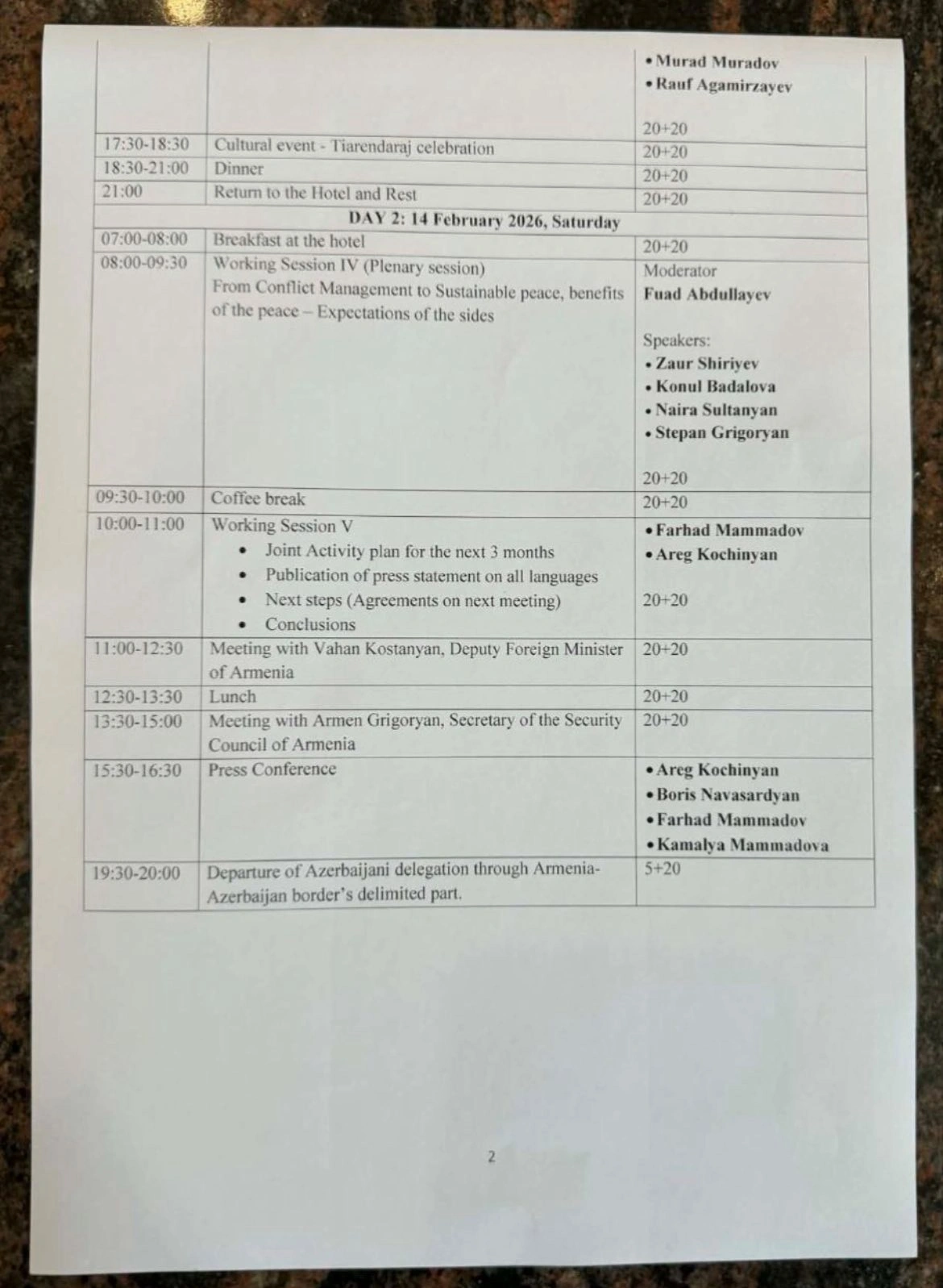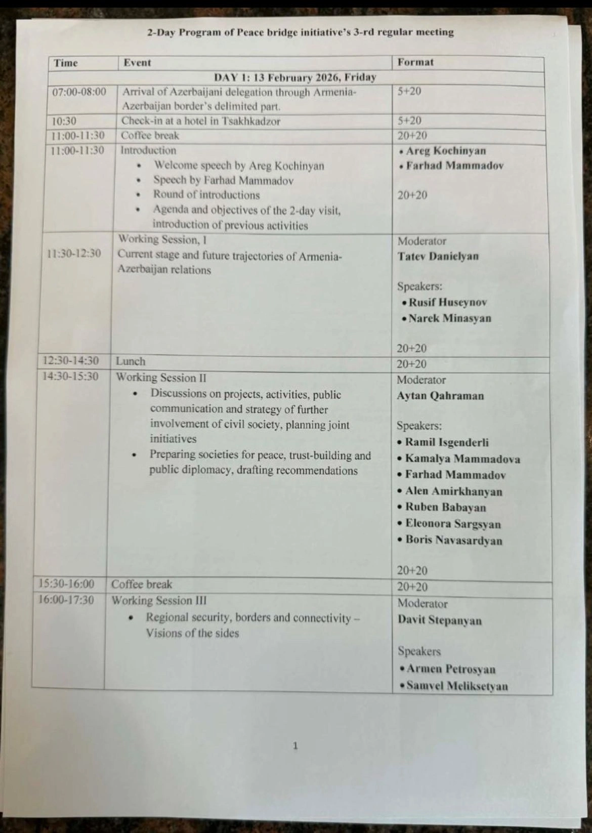 Proqrama əsasən, Azərbaycan nümayəndə heyəti Ermənistanda təxminən 35 saat olub. Bu müddət ərzində 4 saat yol və mehmanxanaya yerləşmə, 4 diskussiya sessiyası, iki rəsmi görüş, mətbuat konfransı və davamlı qeyri-formal dialoq təşkil edilib.