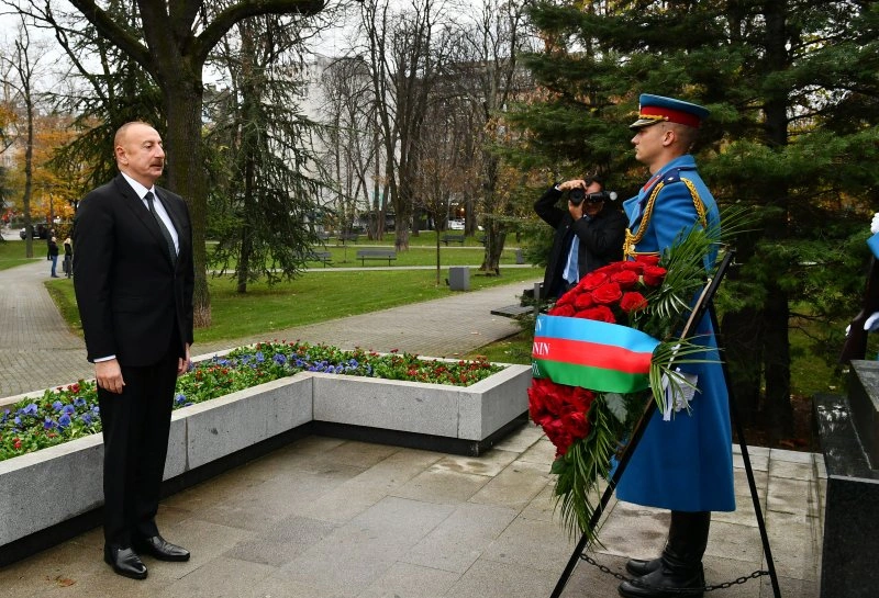 Modern.az xəbər verir ki, dövlət başçısı abidələrin önünə əklil qoyub.